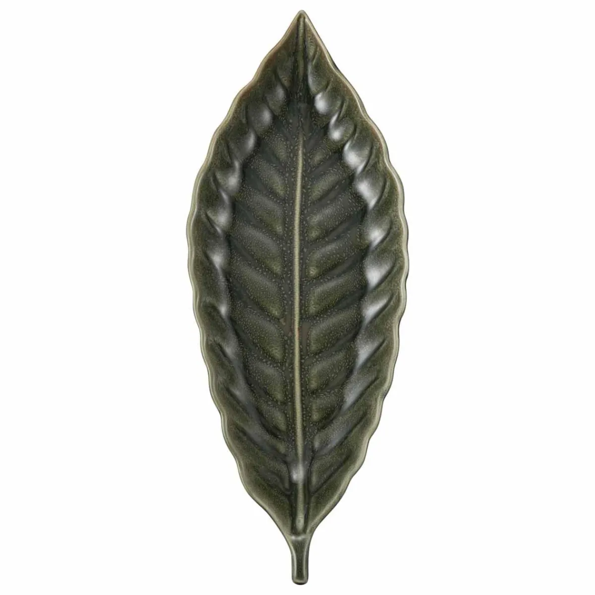 Keramikkfat formet som et blad, med fine detaljer og glansfull overflate. Perfekt som serveringsfat til småretter eller snacks, men like dekorativt alene på bordet. Den organiske formen gir et naturlig uttrykk som passer fint sammen med mørke tresorter, steingods eller lintekstiler.