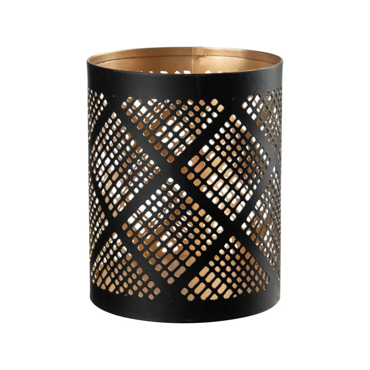 Lekker telysholder i metall, sort utenpå og gull på innsiden. Mønsteret på telysholderen skaper et varmt og vakkert spill av lys fra flammen til telyset.