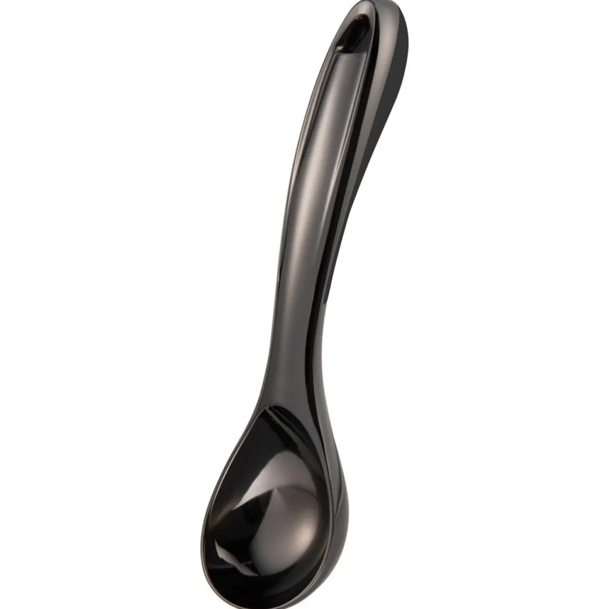 Stilfull sort isskje i forkromet stål. Isskjeen ligger komfortabelt i hånden takket være et mykt silikonlag på undersiden av håndtaket, og skjeen gir deg et godt tak på isen. Ideell for å servere is og andre desserter med stil!