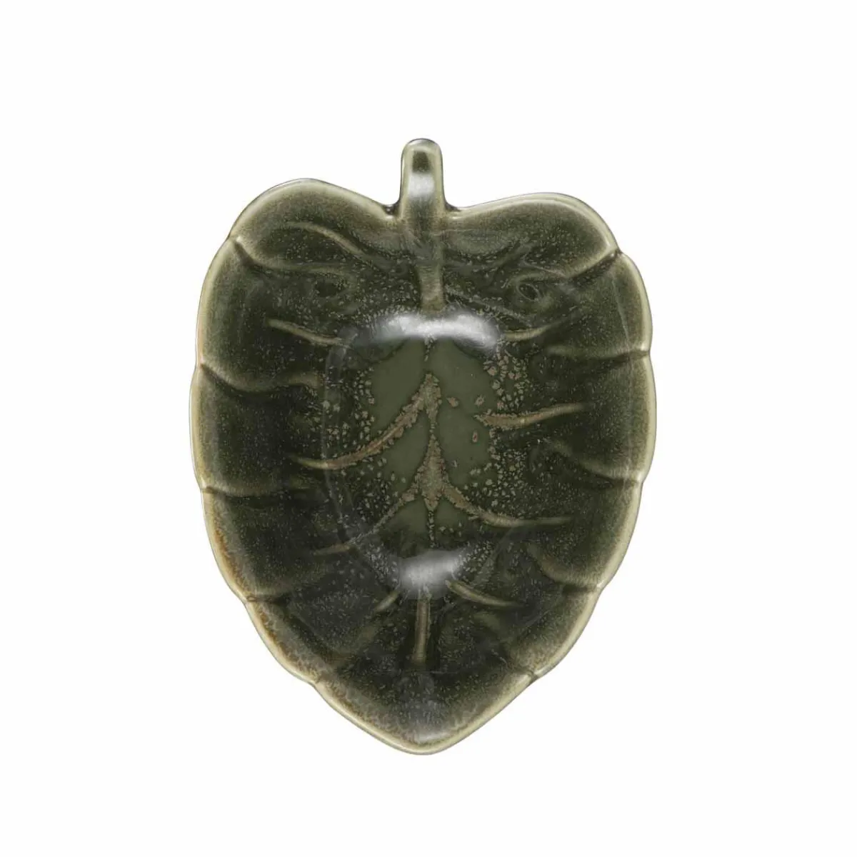 En liten grønn skål formet som et hjerteblad, perfekt for alt fra nøtter og smågodt til hårstrikker og nøkler. Den dekorative formen gjør den like fin på kjøkkenbenken som på stuebordet, og den mørke glasuren passer godt sammen med andre naturinspirerte detaljer.