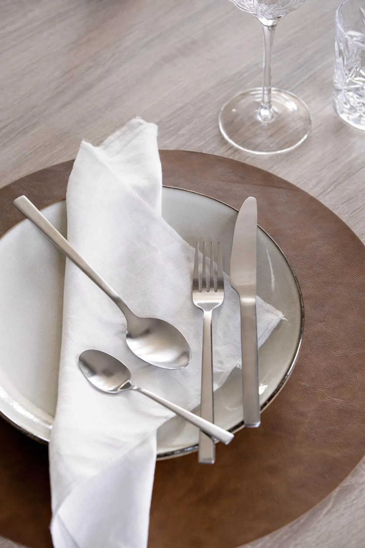 Lekker rund dekkebrikke, perfekt når borddekkingen trenger det lille ekstra. Dekkebrikkene er laget i imitert skinn og . Bordbrikken er enkel å holde ren.