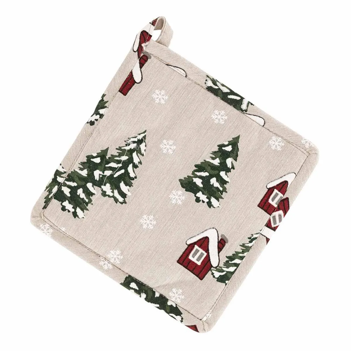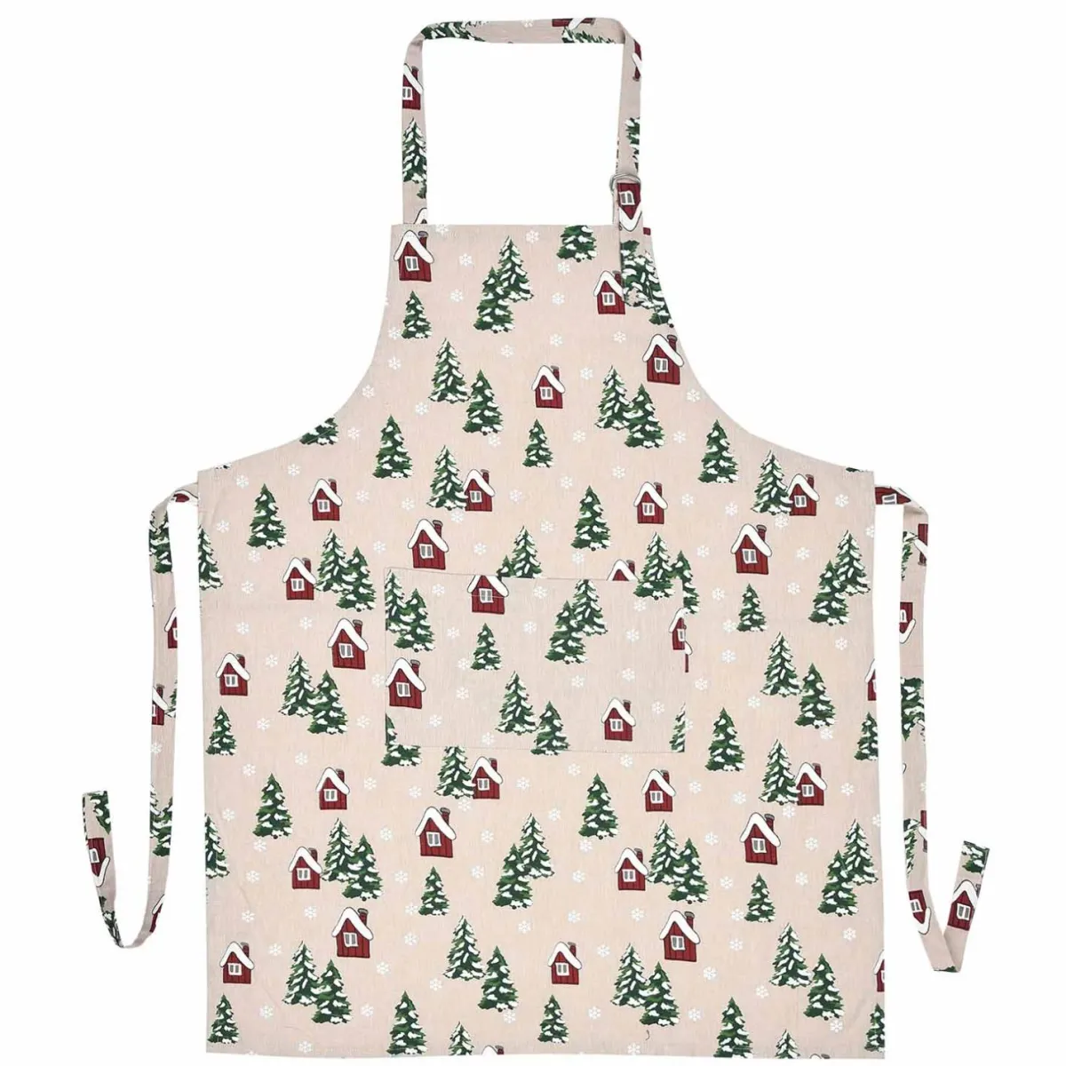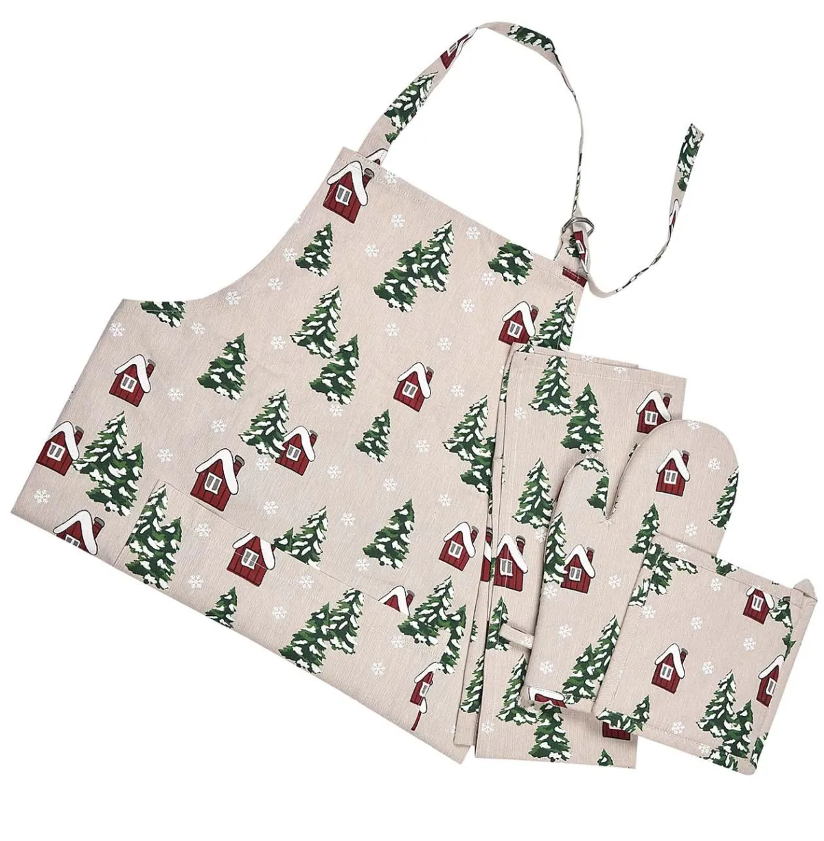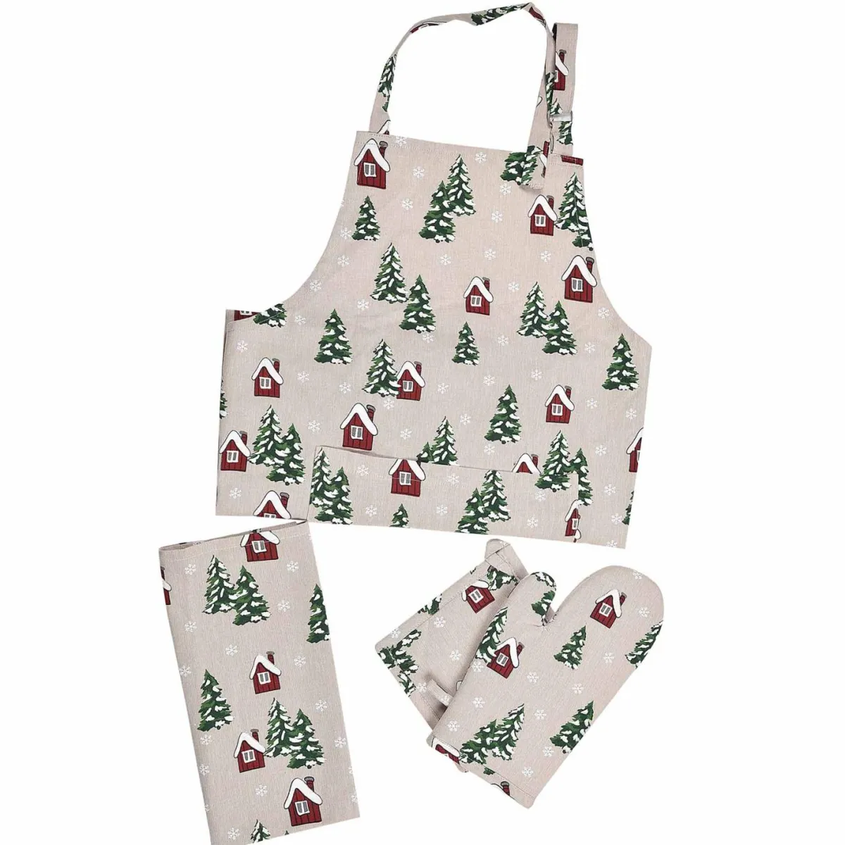 Dette settet inneholder et forkle, gryteklut, og kjøkkenhåndkle, alle dekorert med et koselig vintermotiv av snødekte hus og grantrær. Perfekt for å skape en hyggelig stemning på kjøkkenet i juletiden. Forkleet gir god dekning når du lager mat eller baker, mens grytekluten og kjøkkenhåndkleet gjør det enkelt å håndtere varme gryter og tørke opp. Et flott tillegg til juleforberedelsene eller som gave til en som elsker å tilbringe tid på kjøkkenet.