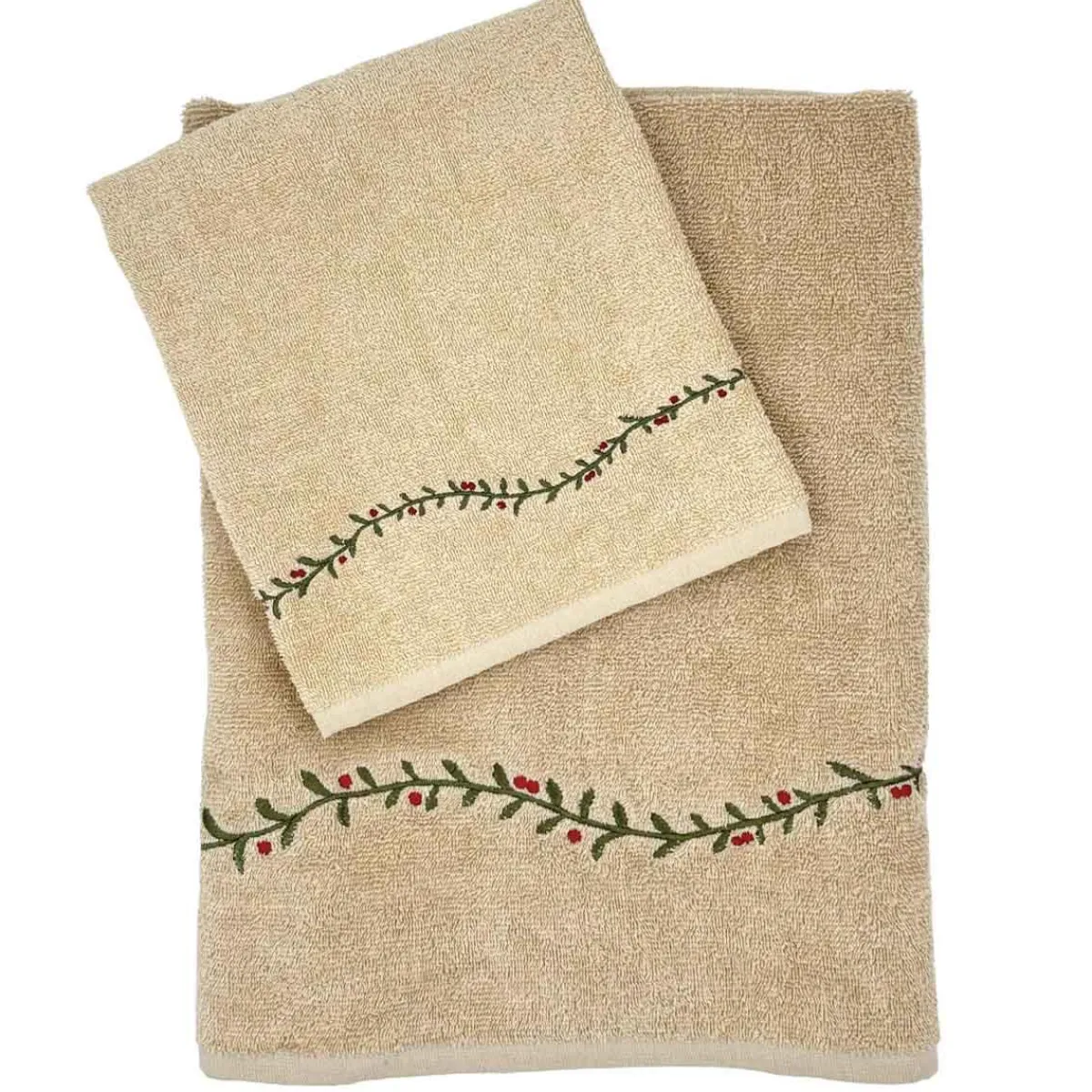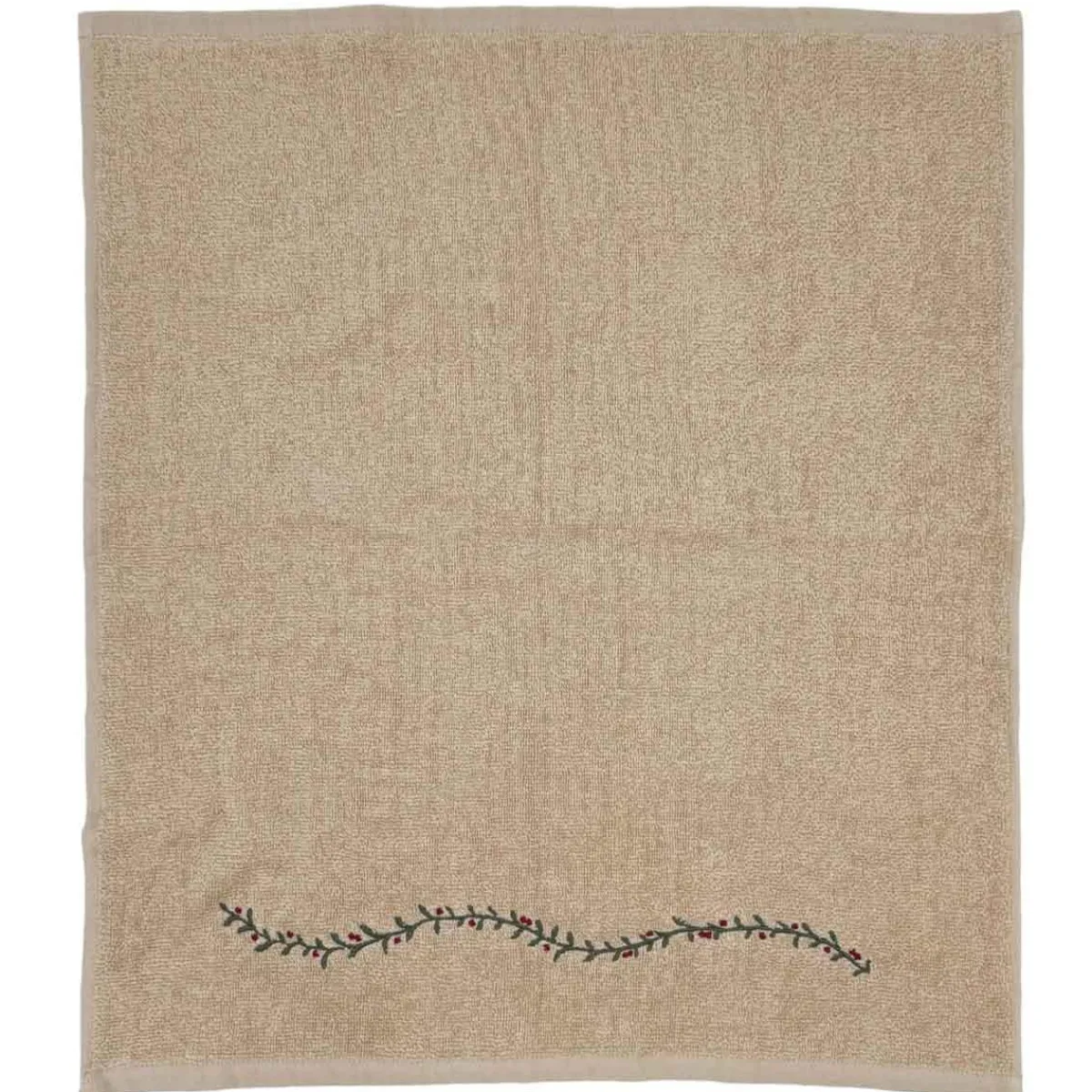 Mykt håndklesett med julebroderi av en grønn girlander med røde bær. Settet består av ett gjestehåndkle og ett badehåndkle i lun beige farge. Et stemningsfullt innslag til badet i høytiden – både praktisk og dekorativt.