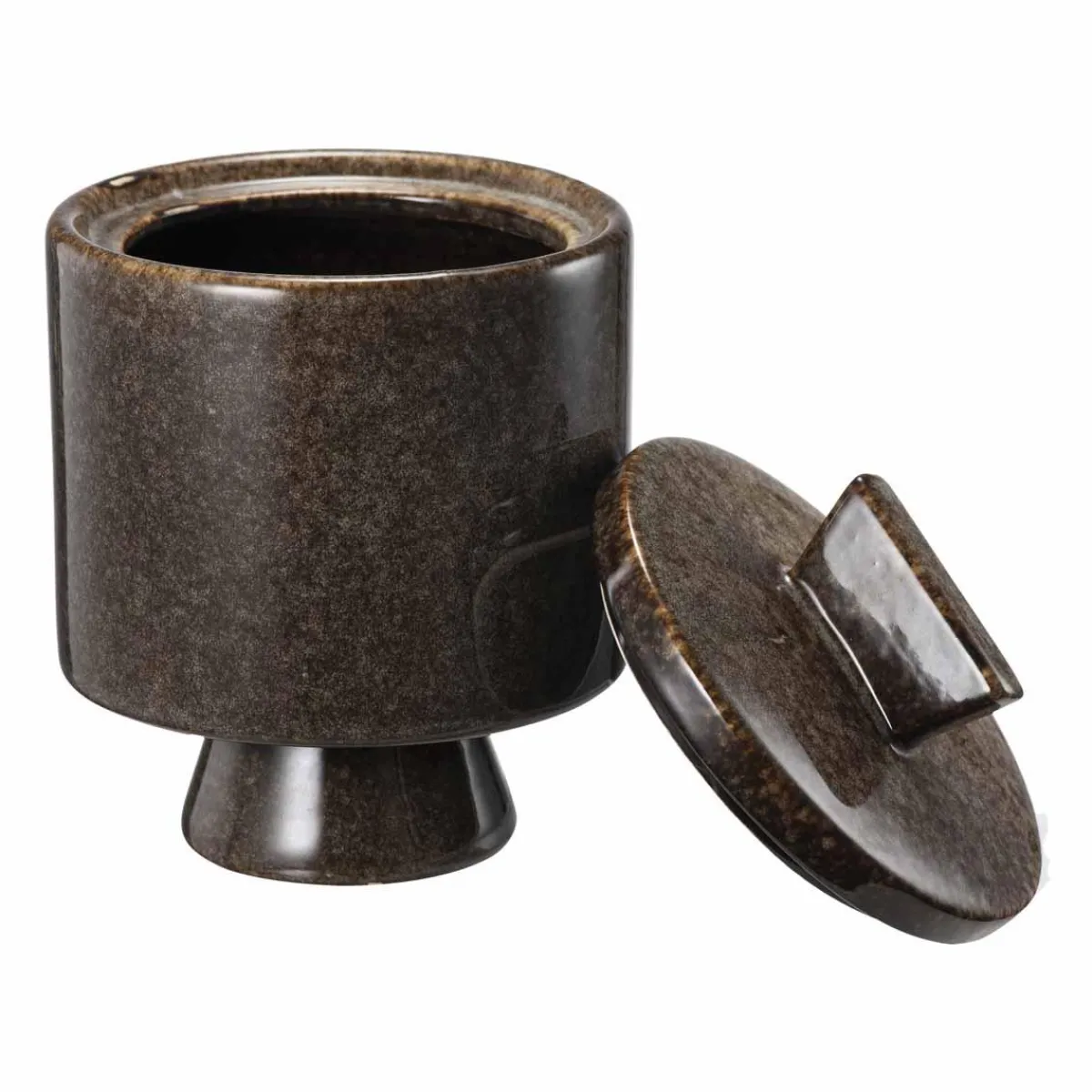 En fin måte å samle småting på – enten det er bomullspads på badet, teposer på kjøkkenet eller sykker på nattbordet. Formen gir karakter, og lokket holder innholdet skjult og beskyttet. Den mørke glasuren gir et lunt uttrykk.