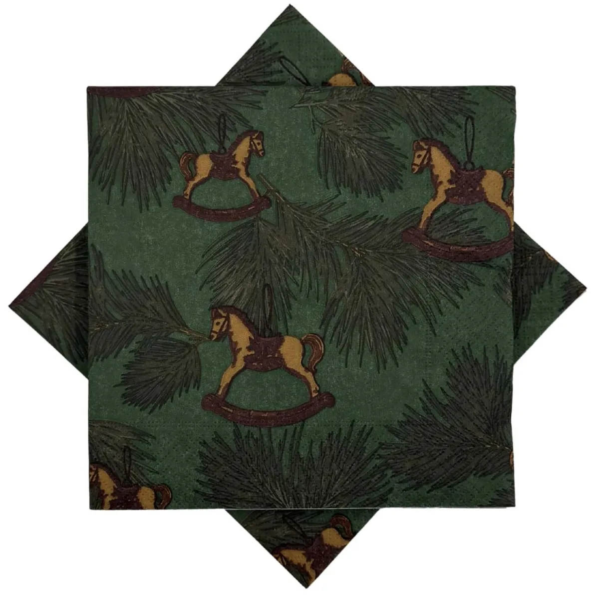 Papirserviett med nostalgisk gyngehest og grønne barnåler på mørkegrønn bakgrunn. En klassisk julefavoritt som setter stemningen ved bordet.