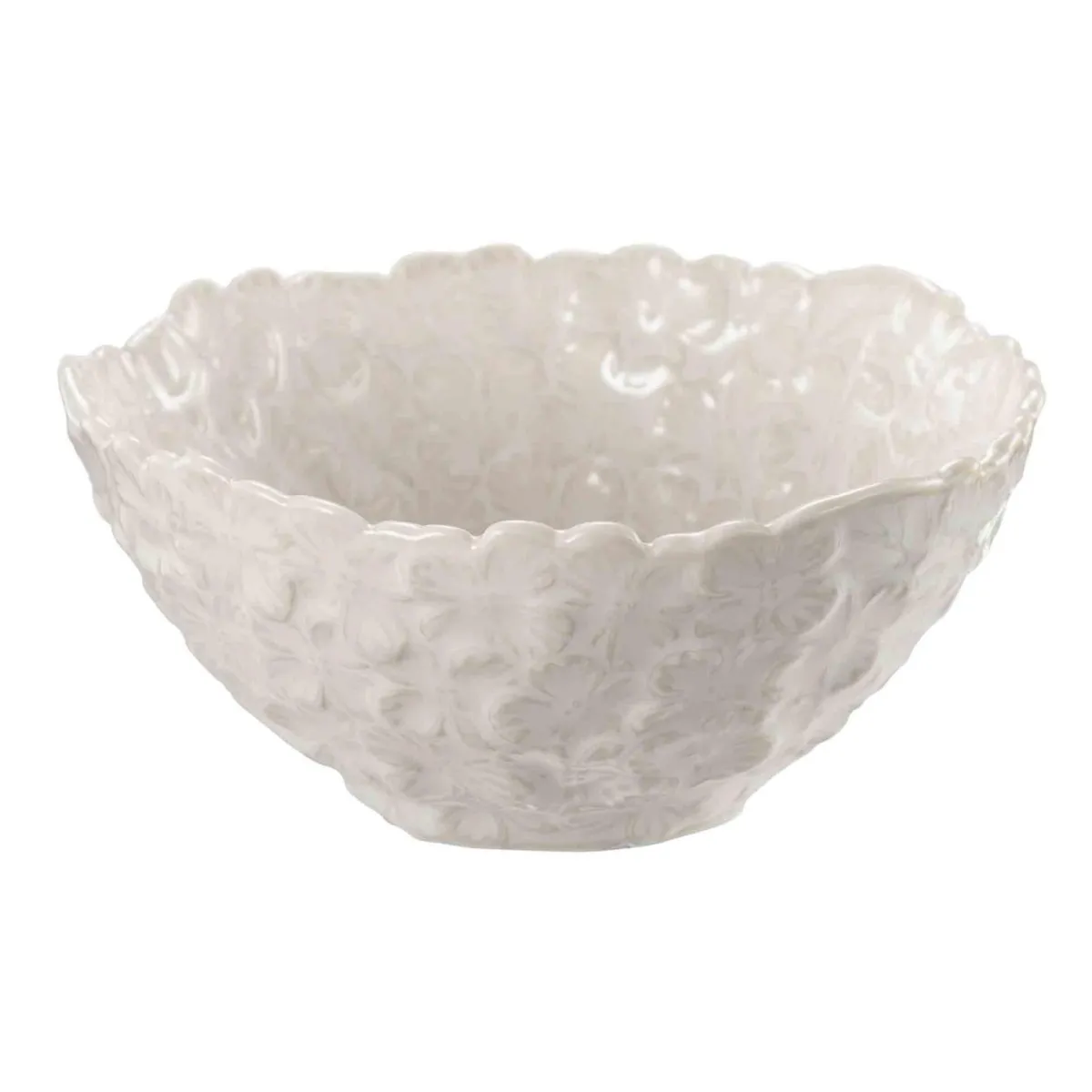 Nydelig hvit skål, med småblomstrete struktur. Fin som et ekstra tilskudd til serviser eller til frukt og bær.