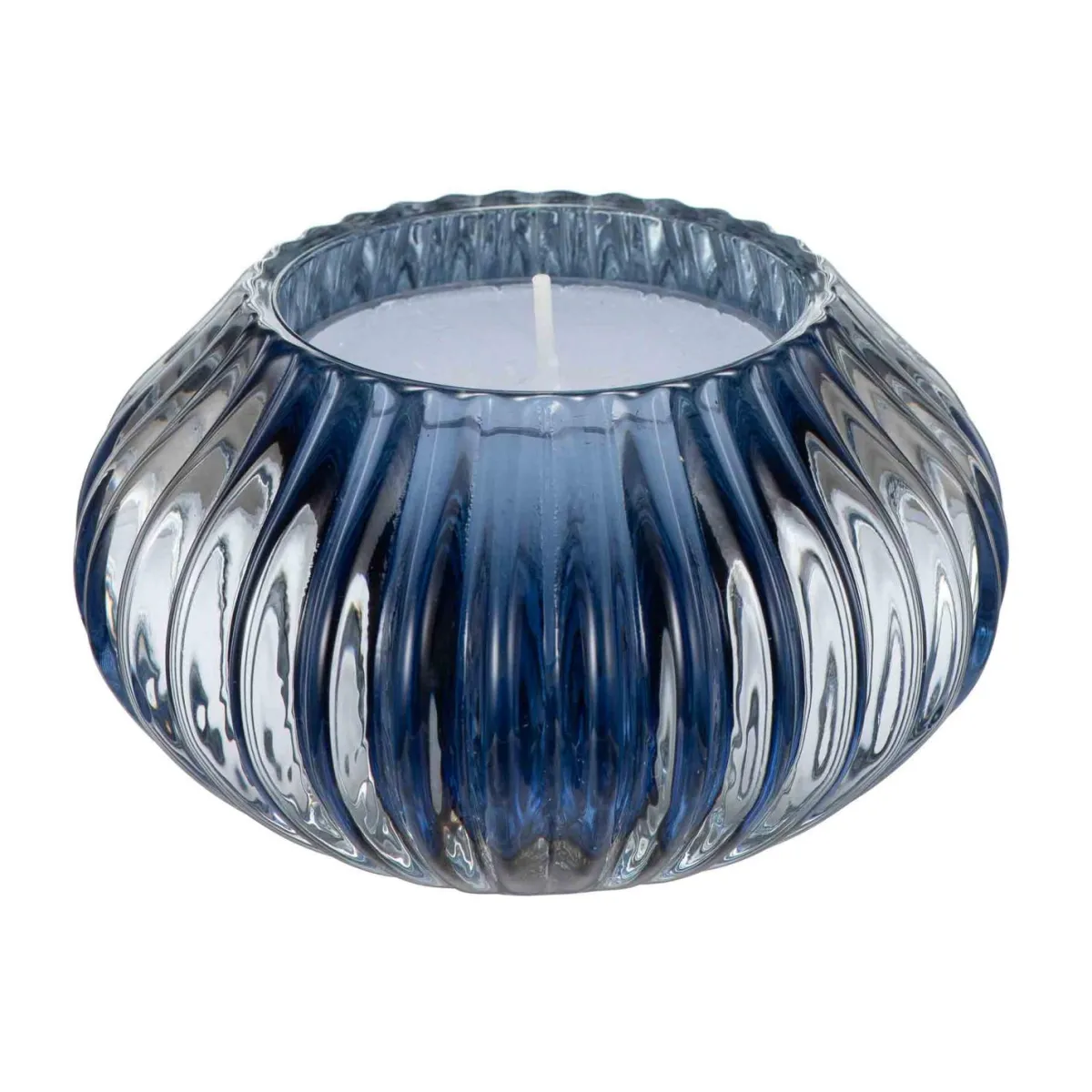 En lysestake som kombinerer dyp blåfarge med elegante riller i glass. Skaper en nydelig lyseffekt som passer perfekt til kveldsstemning. Ideell for telys og liten nok til å plasseres hvor som helst – på en bokhylle, et nattbord eller som en del av en dekorativ borddekking.