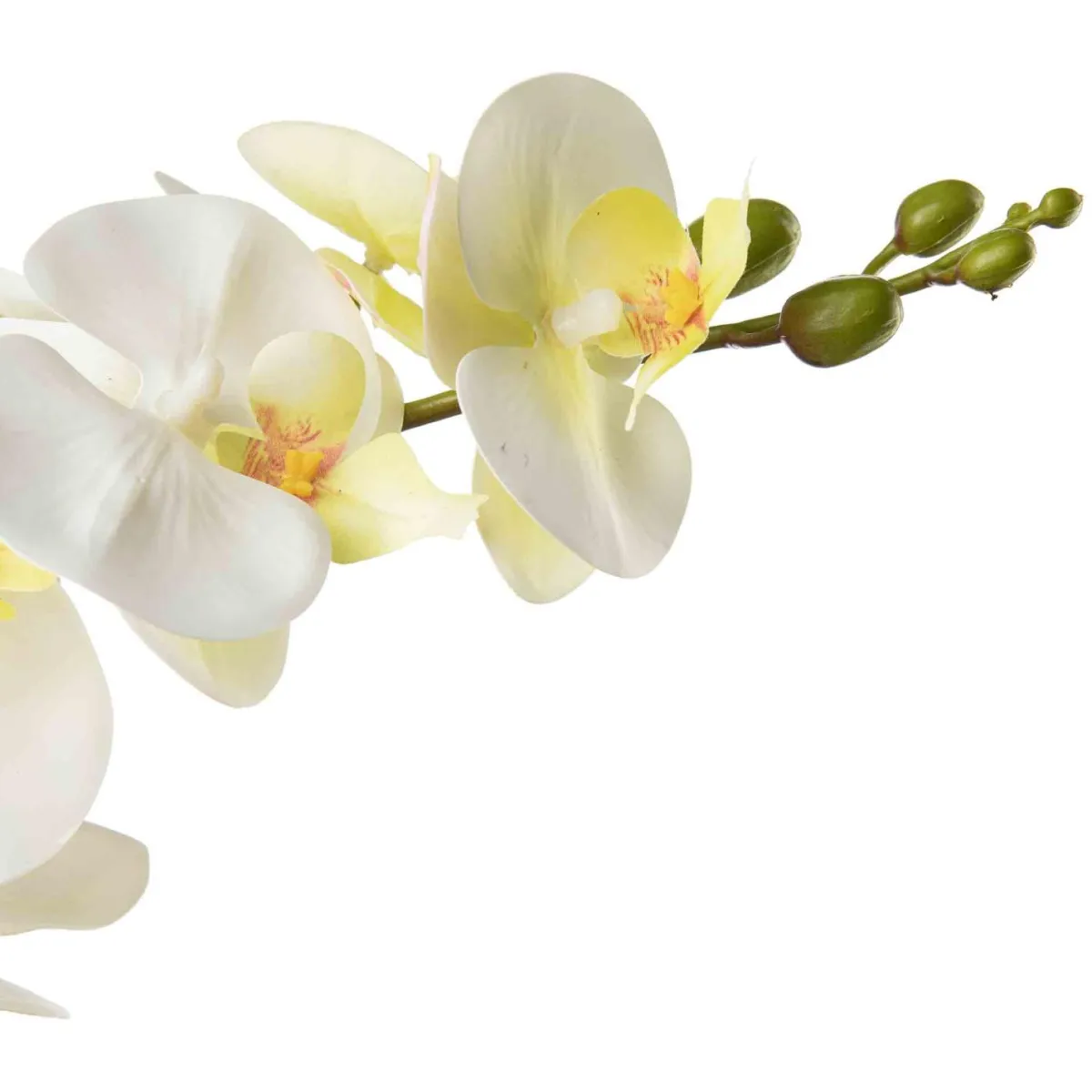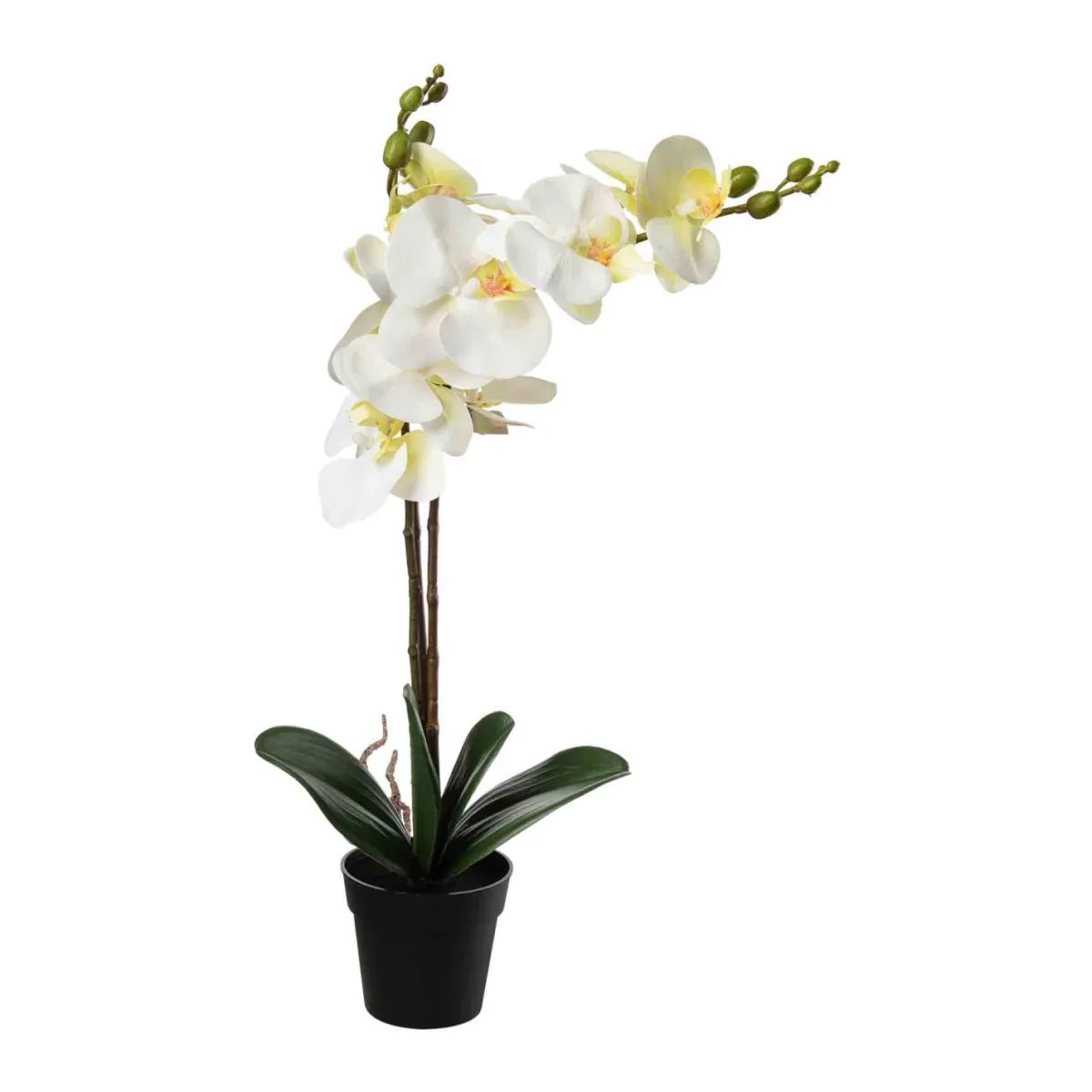 En orkidé som alltid ser frisk og elegant ut, uten behov for vanning. De vakre hvite blomstene med subtile gule detaljer gir et tidløst uttrykk, perfekt til alle rom. Kombiner med en dekorativ potte i keramikk for et personlig preg, eller plasser den på et brett sammen med telysholdere og små grønne planter for et koselig arrangement. Lett å plassere i både små og store rom, og like pen på spisebordet som i vinduskarmen.