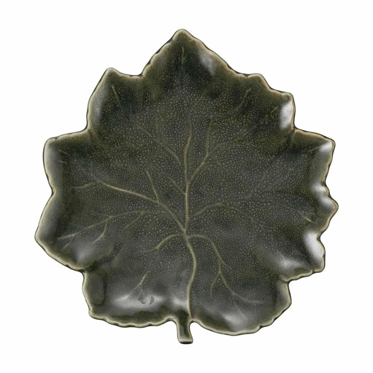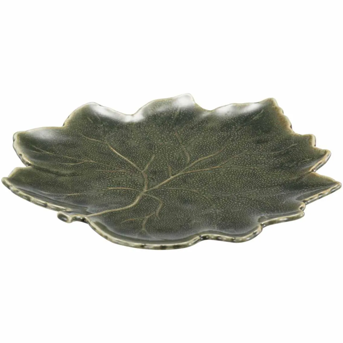 Med form som et lønneblad og glasur i dype grønntoner gjør denne asjetten seg godt både som dekorelement og til små serveringer.