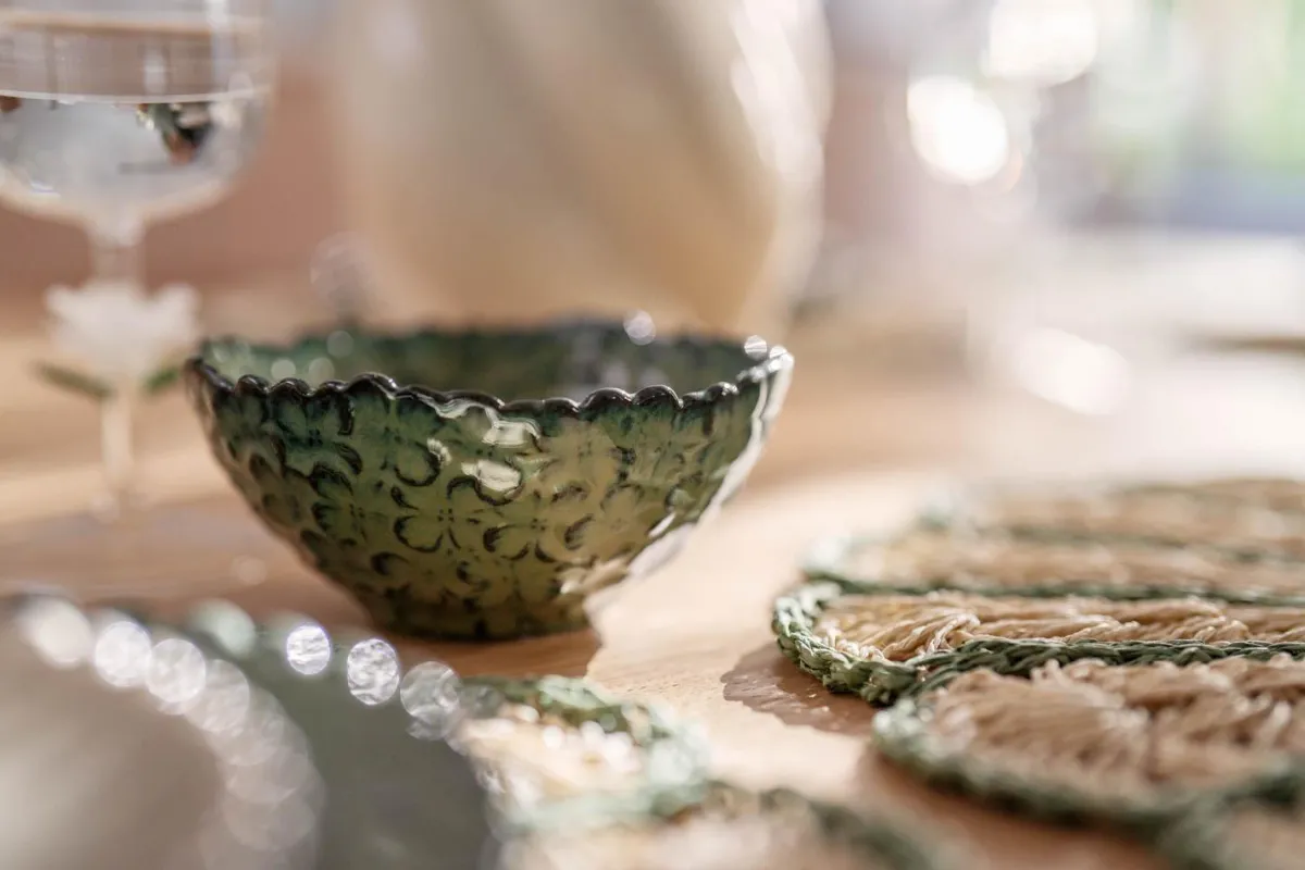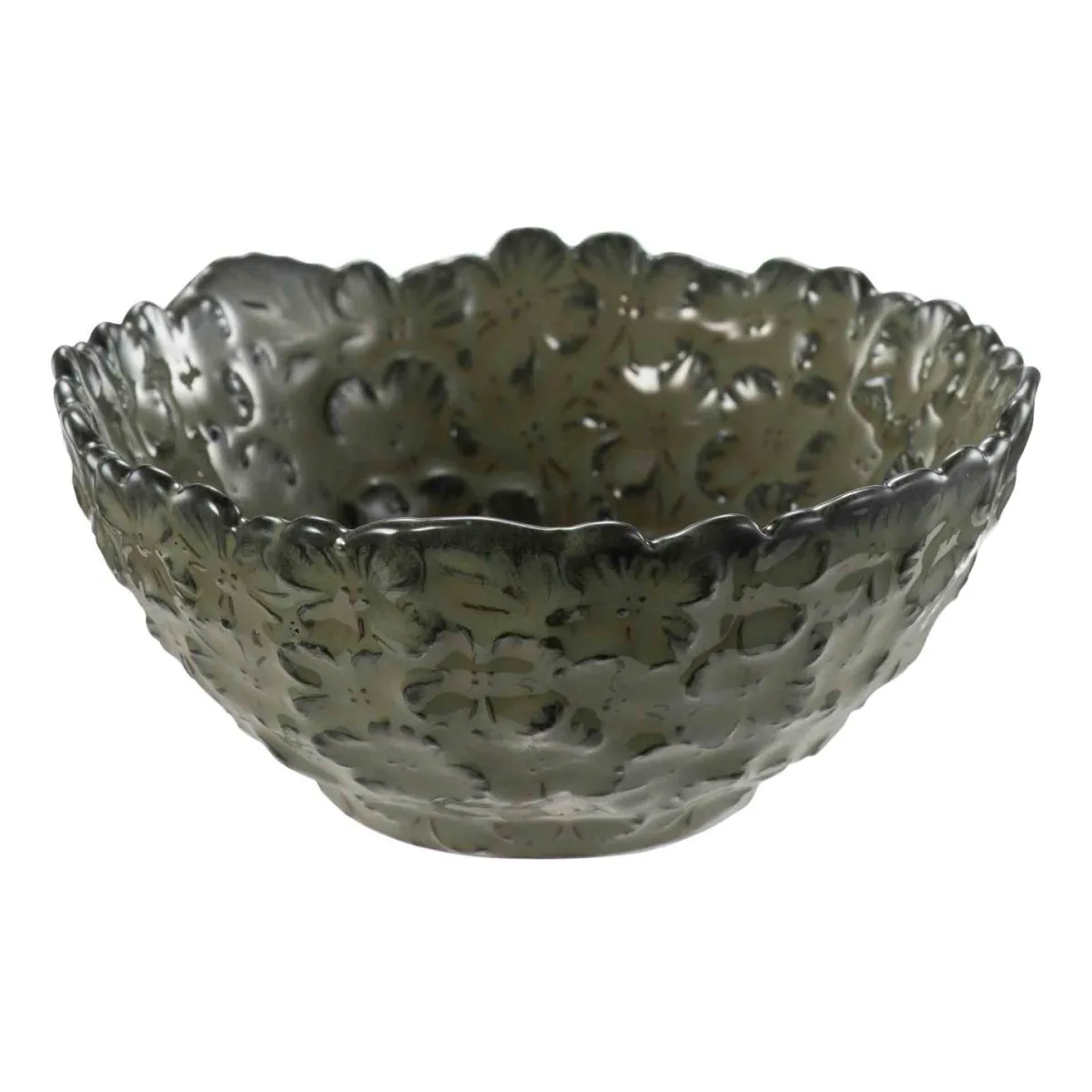 Lekker grønn skål, med småblomstrete struktur. Fin som et ekstra tilskudd til serviser eller til frukt og bær.