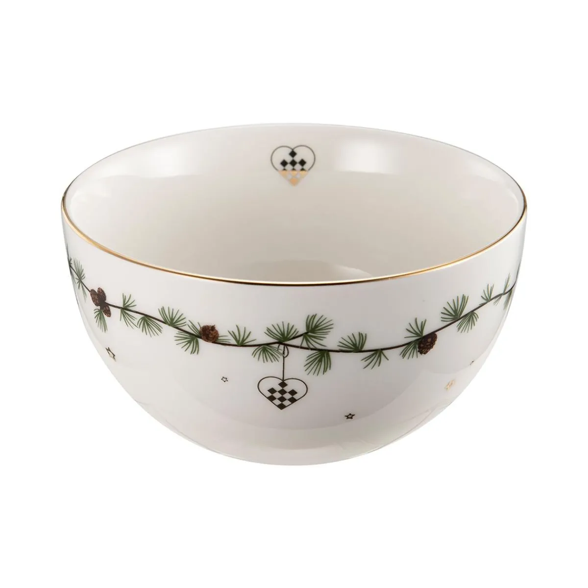 En nydelig juleskål dekorert med kongler, granbar og julehjerter i duse toner og detaljer i gull. Passer like godt til frokost som til julekvelden. Kombiner gjerne med matchende servise for en helhetlig juledekket bord.