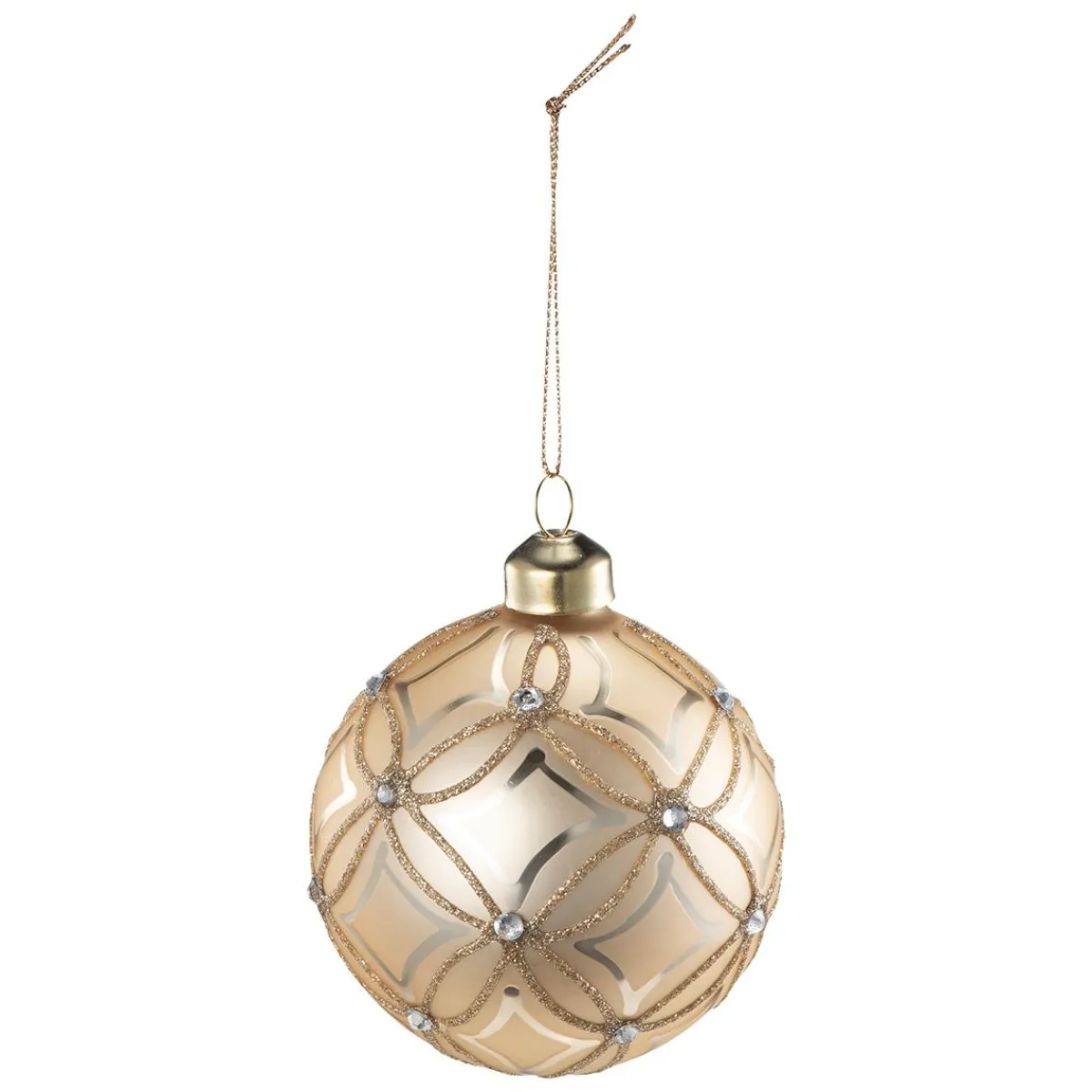 En gyllen julekule dekorert med glittermønster og små stener som fanger lyset vakkert fra juletrelysene. Den varme fargen skaper en lun og festlig stemning. Kombiner den gjerne med våre andre for et personlig og helhetlig uttrykk på juletreet.