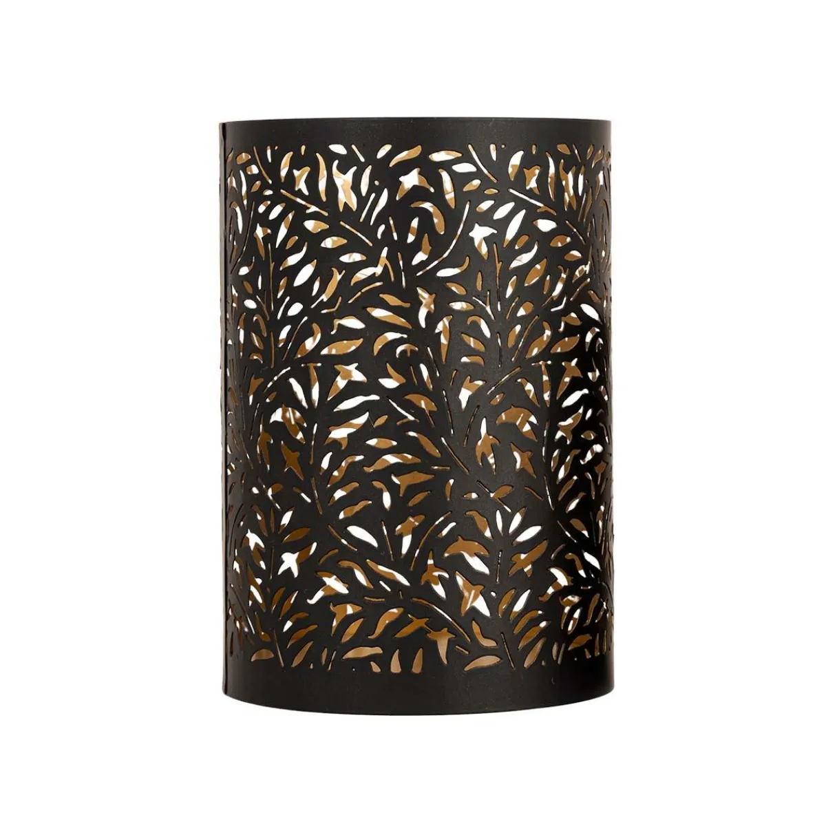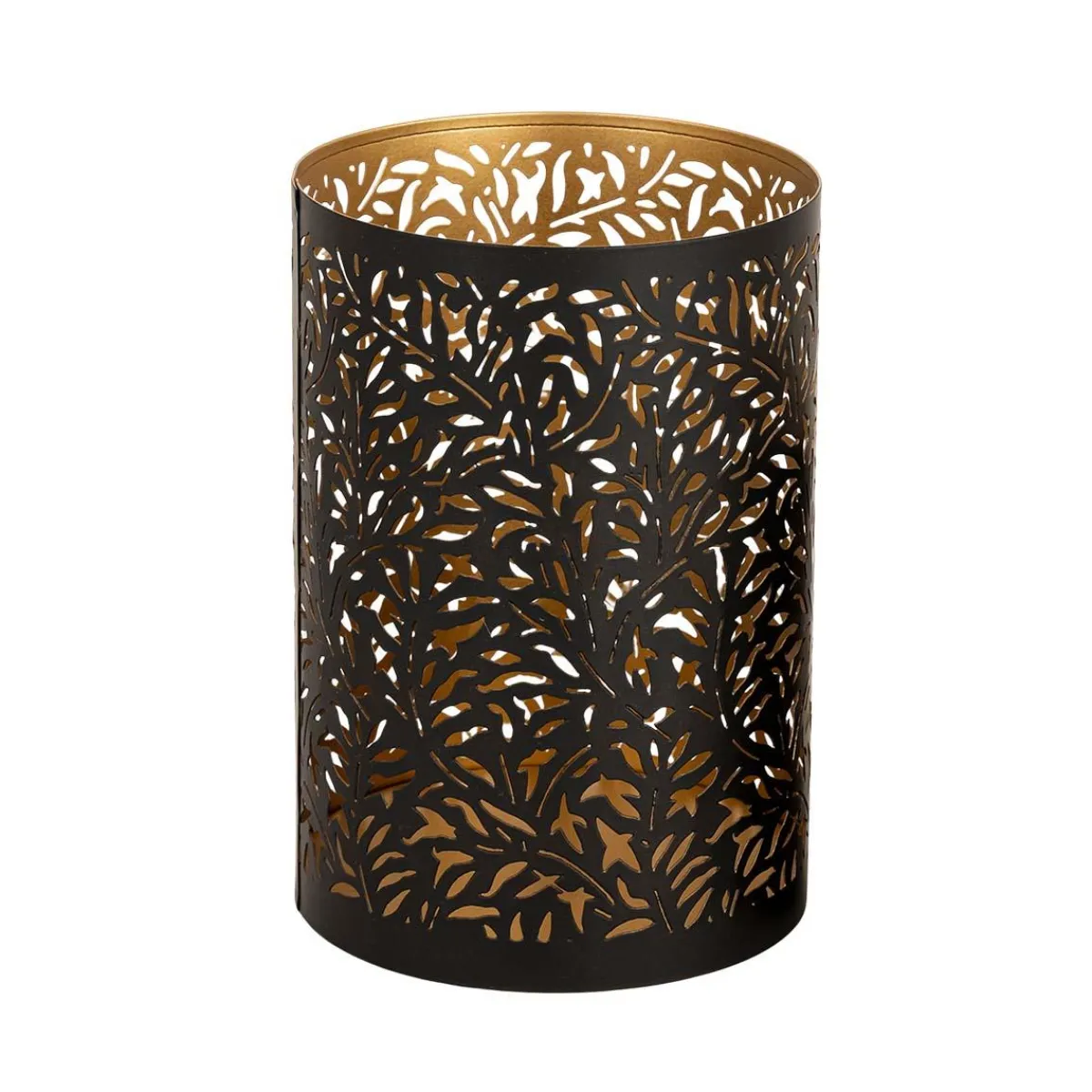 Lykten i sort metall med utskåret bladmønster sprer lyset i fine mønstre når telyset er tent. Innsiden i gyllen metall gir et varmt og lunt uttrykk, både alene og sammen med andre lykter. Prøv den sammen med den for en balansert lysgruppe.