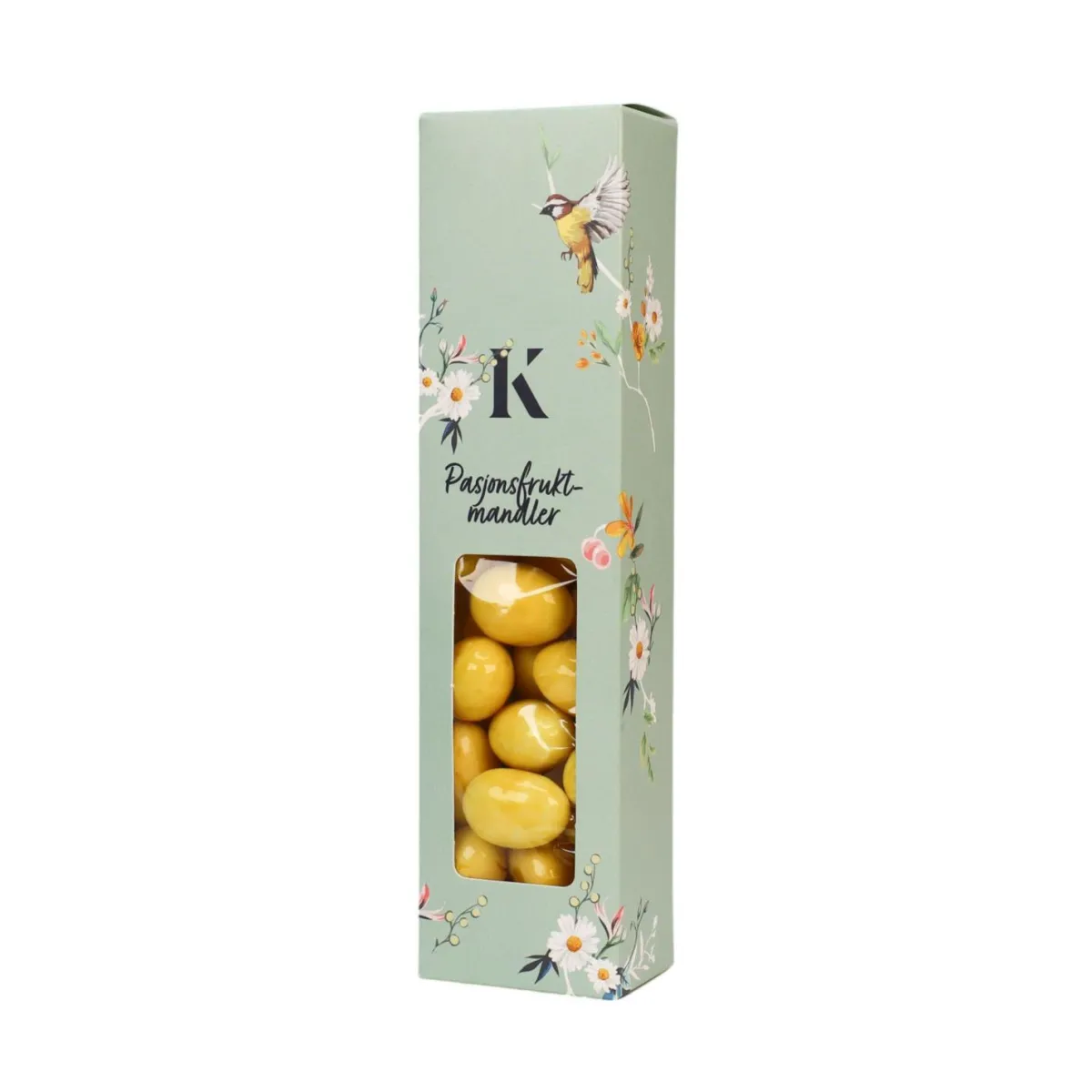 Mandler overtrukket med hvit sjokolade og smak av pasjonsfrukt.