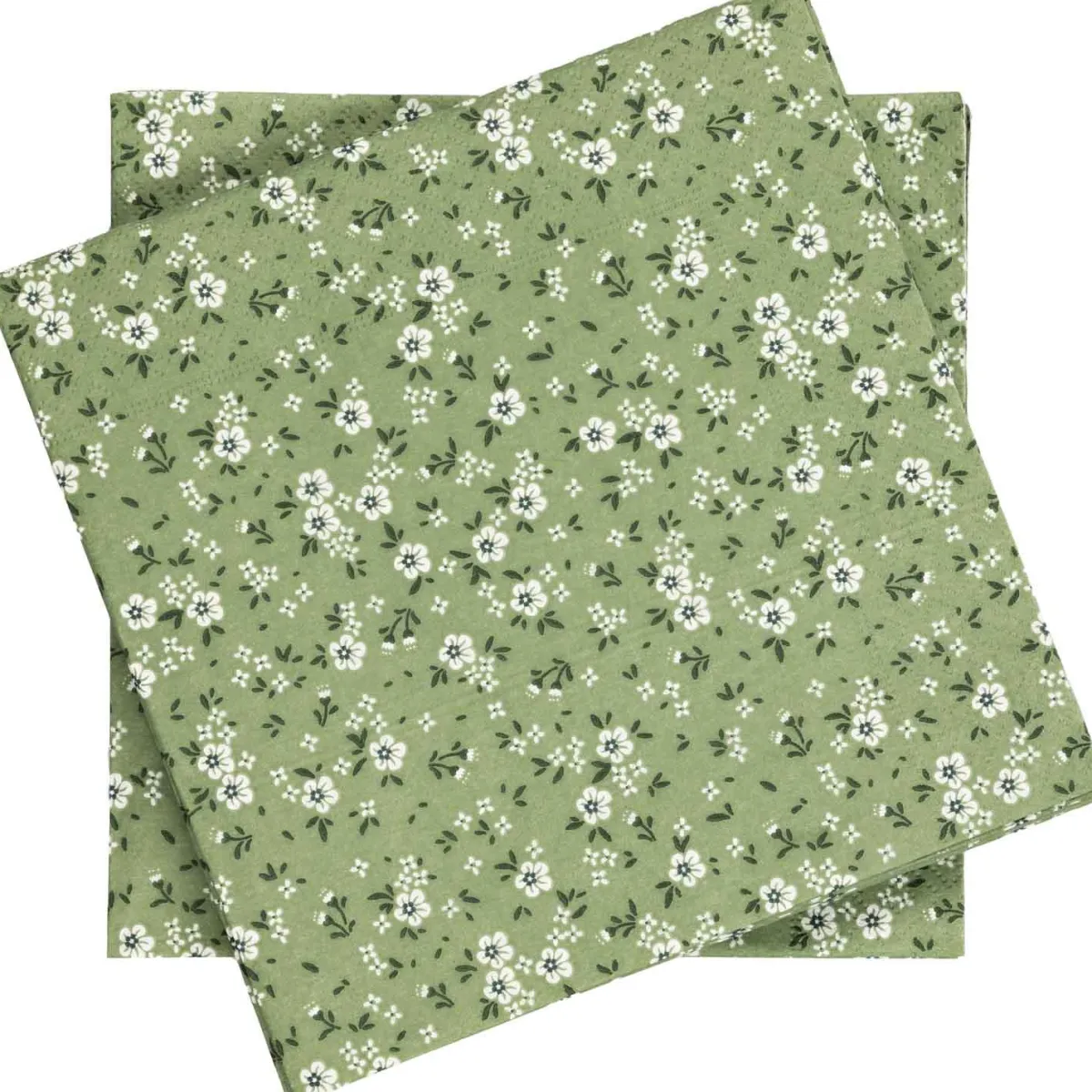 Nydelige papirservietter med mønster av små, grønne vårblomster. Nydelig såvel til påskefrokosten som festbordet! Kvadratisk form.