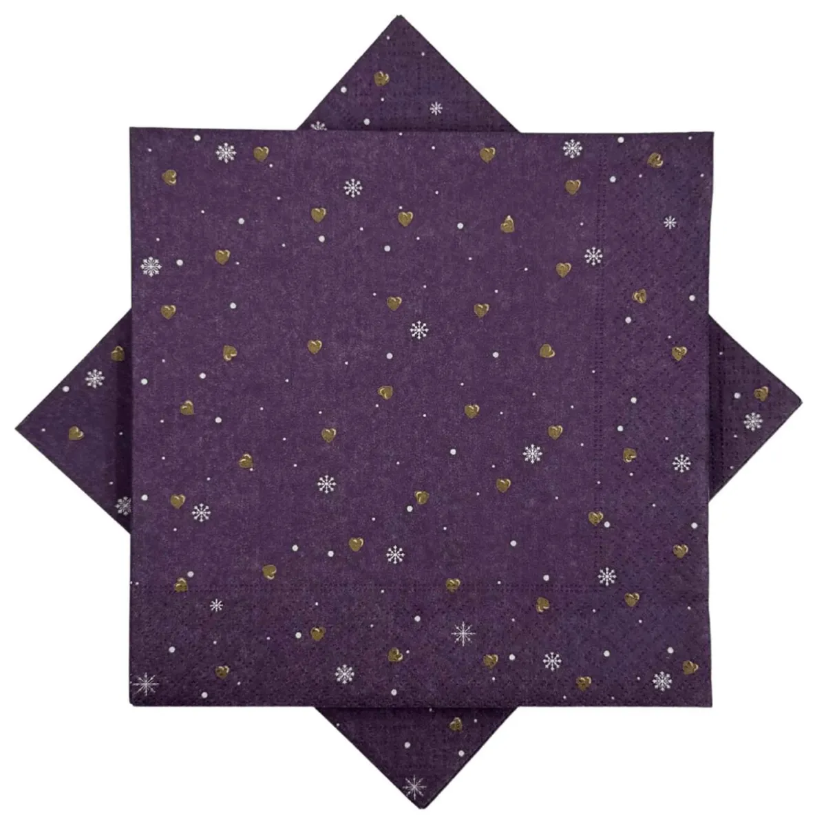 Papirserviett i dyp lilla med små gullhjerter og snøkrystaller. En leken og elegant detalj til julebordet. Perfekt til både hverdag og fest i førjulstiden.