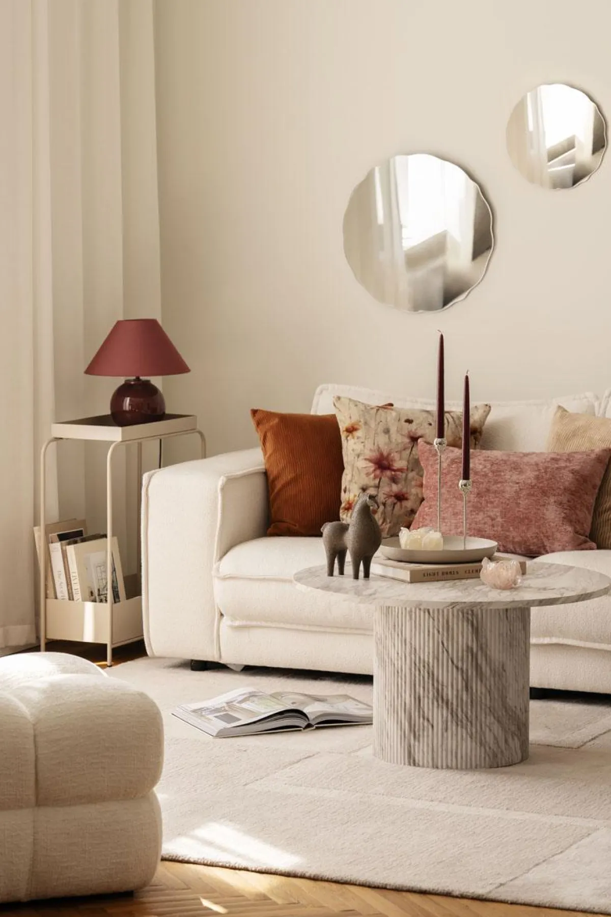 Speilet har en bølget kant som gir veggen et mildt og leken uttrykk. Størrelsen gjør det lett å plassere, enten det er på et lite bad, over en kommode eller som del av en bildevegg.