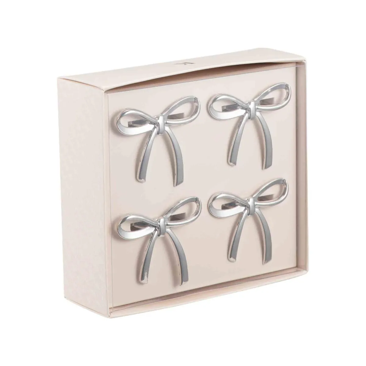 Sett med fire elegante serviettringer formet som sløyfer, perfekte for å gi borddekkingen et stilfullt og gjennomført uttrykk. Passer til både hverdag og fest. Kombiner gjerne med våre , og annet for et helhetlig preg.