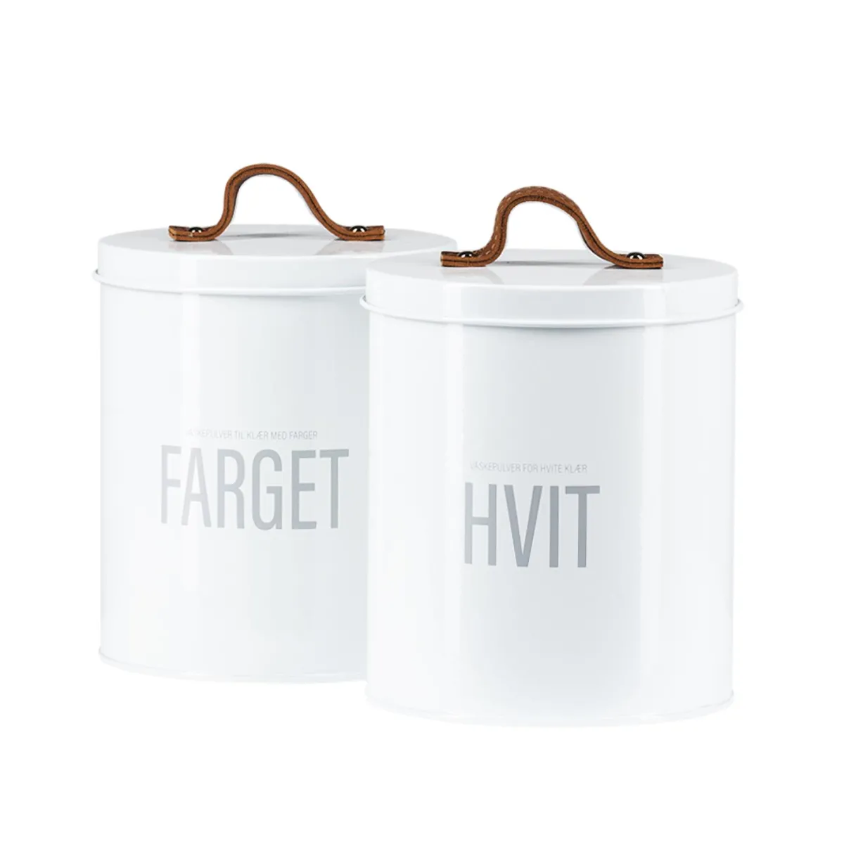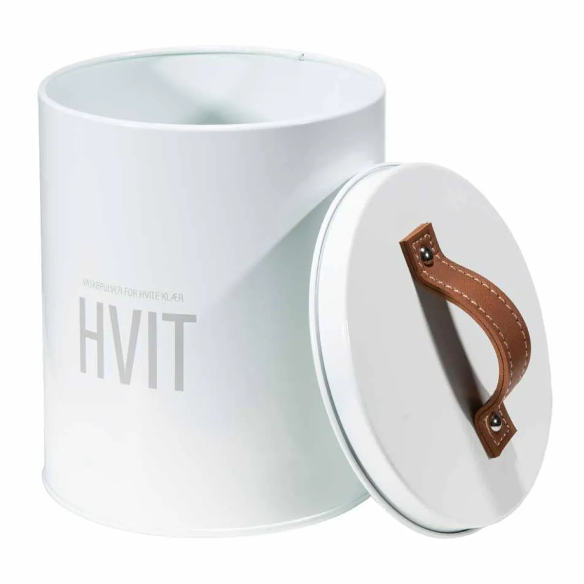 Praktisk vaskepulverboks i tidløst design. Den runde formen er tidsaktuell og lærhåndtakene gir boksen det lille ekstra. Finnes for også.